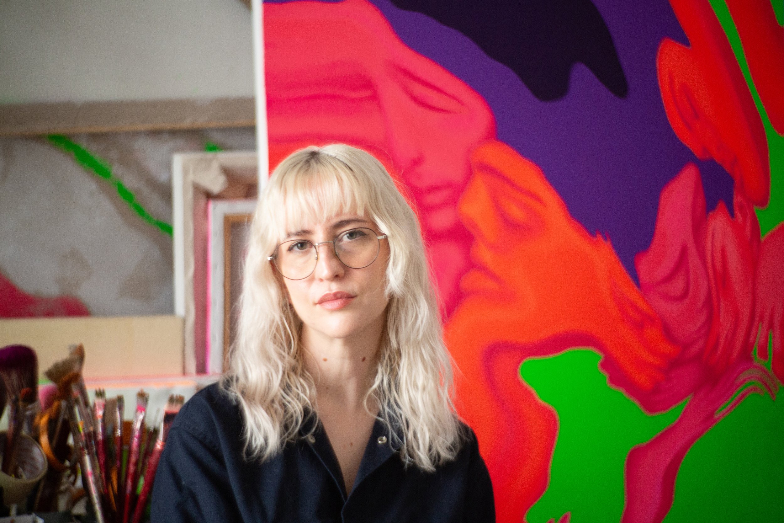 Fascinated by the challenge of replicating digital hues on canvas, she uses fluorescent acrylics and oils to translate the saturation and luminosity of digital colour into paint. Distorted human figures are a recurring theme in her work, through which she explores the tension between dreams and nightmares.